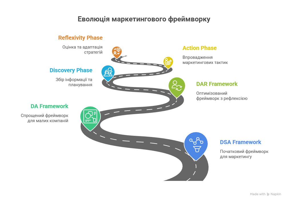 Сьогодні, маючи рік досвіду роботи моєї команди маркетологів на аутсорсі та 18 активних проєктів на веденні, я ще раз доробив цей фреймворк. Тепер я називаю його DAR – Discovery → Action → Reflexivity.